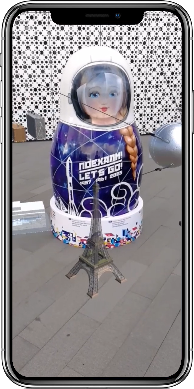 При наведении камеры приложения на метрешку, вокруг нее появляются экспонаты всемирных выставок, которые были представлены на ЭКСПО за всю его историю: восемь мировых и восемь российских